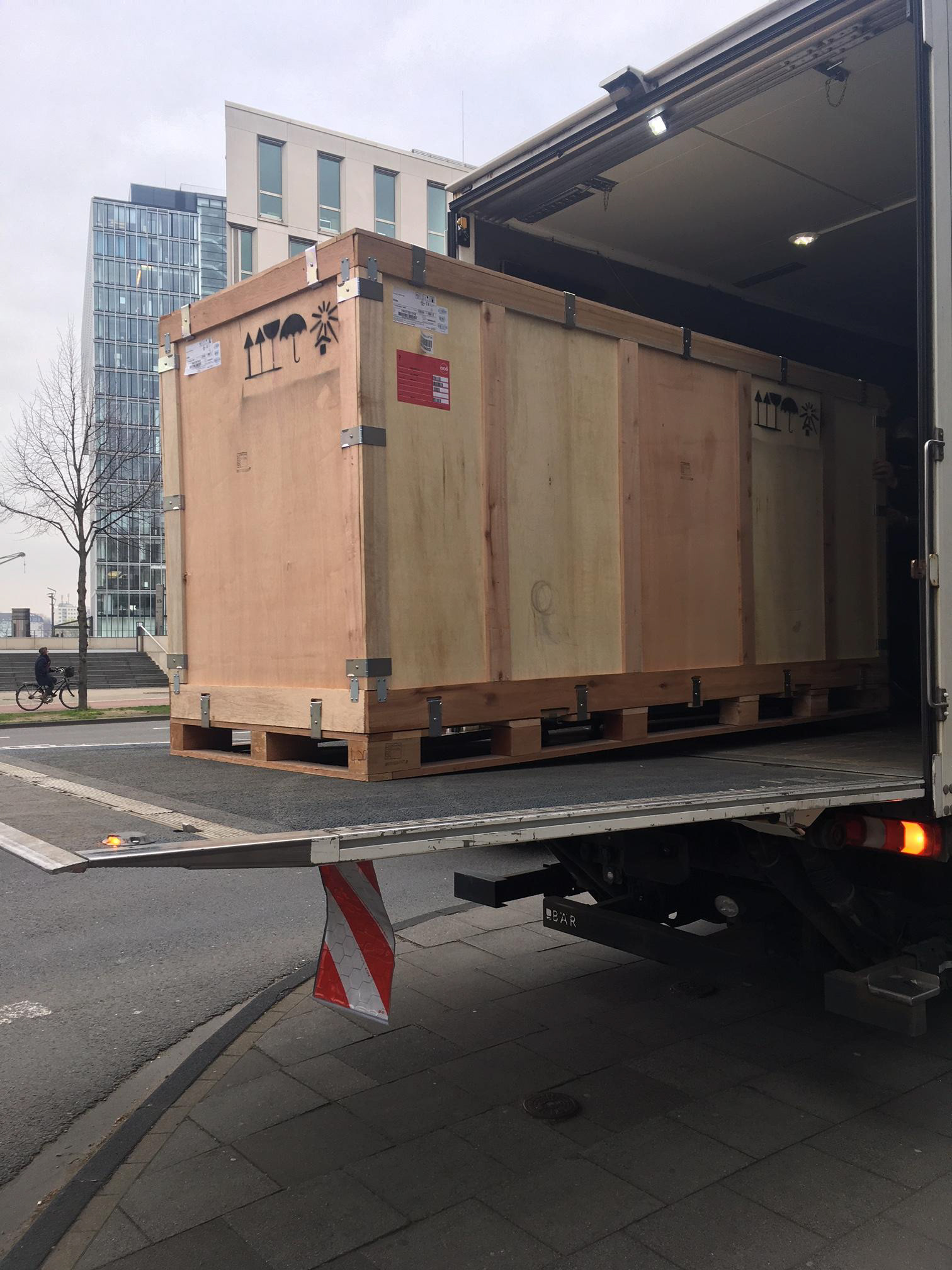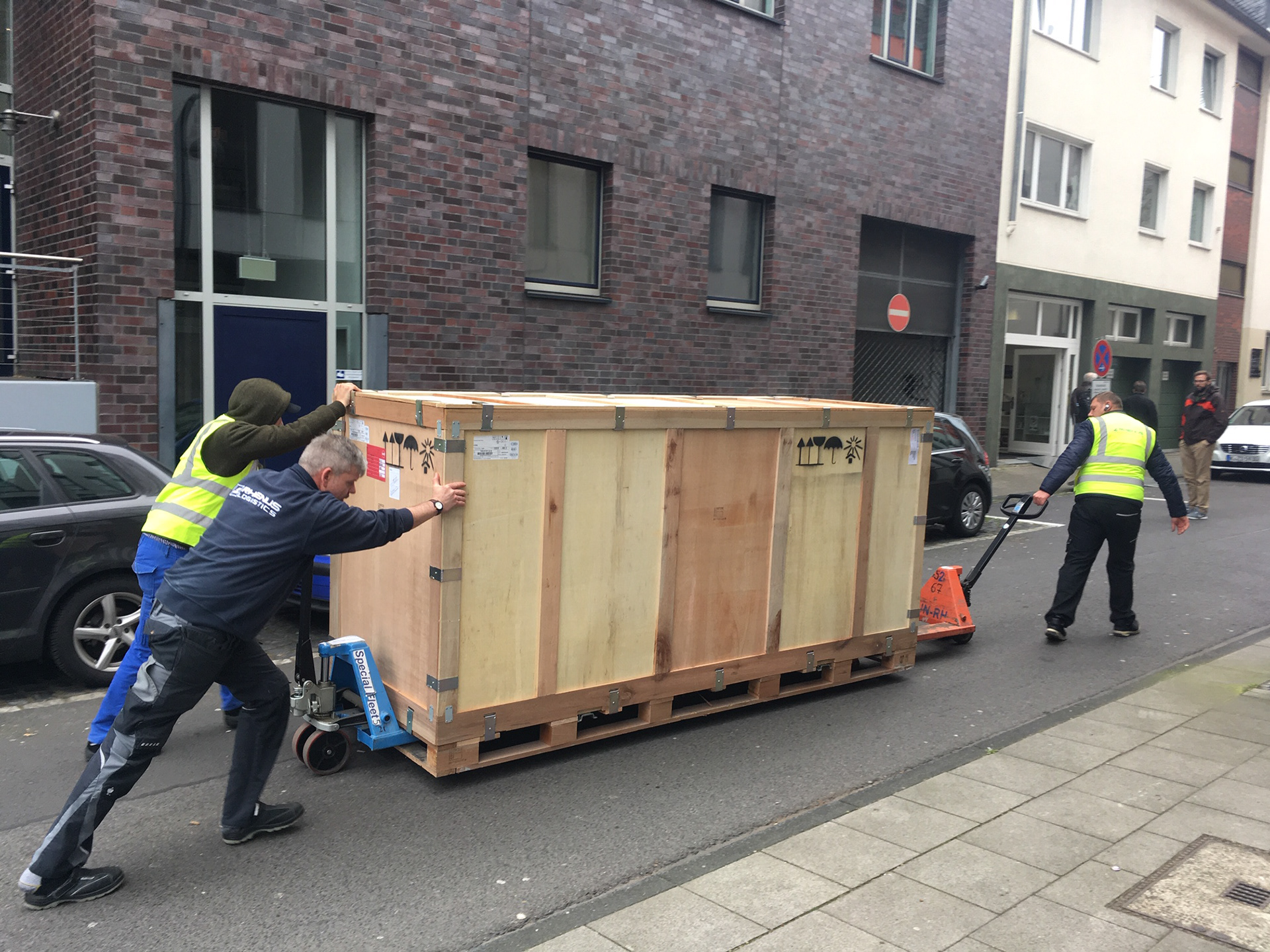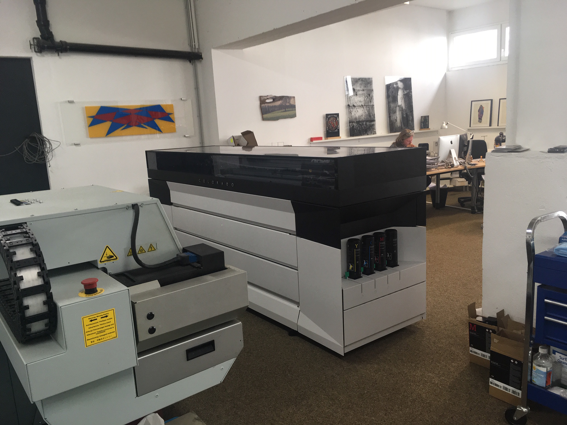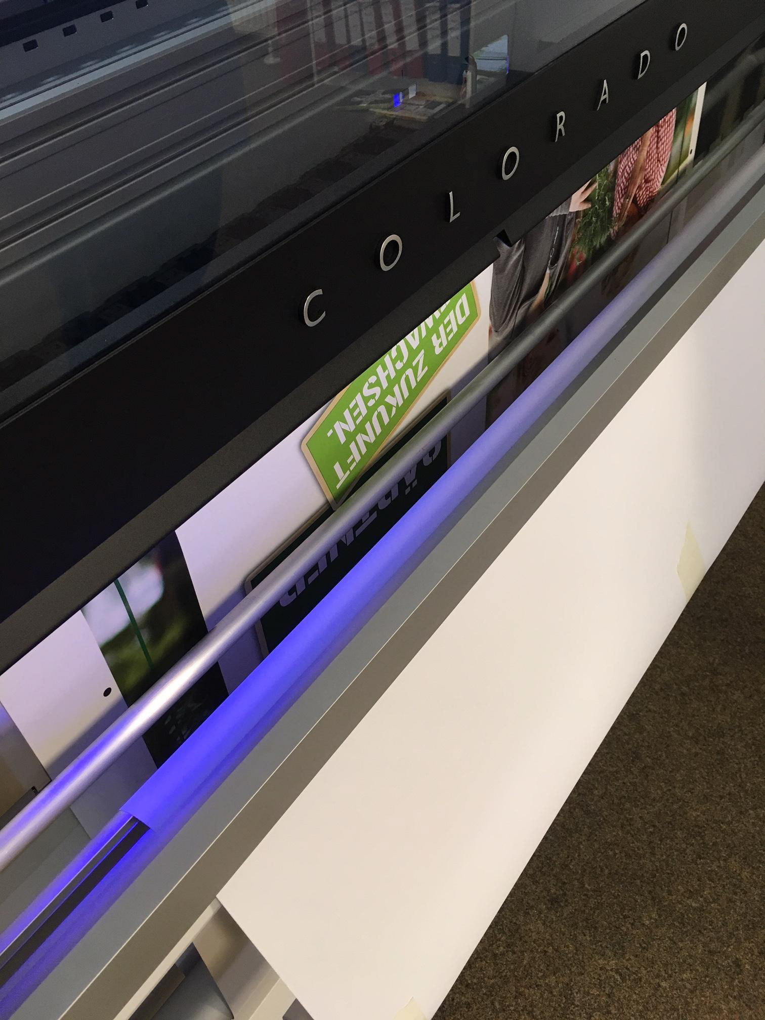 Ein Tag Arbeit und viel Manpower, schon war´s geschafft. Die Colorado nimmt ihren Betrieb auf. Schon in der ersten Woche produzierten wir über 1.000 qm UV-Geldrucke auf unterschiedlichsten Materialien.